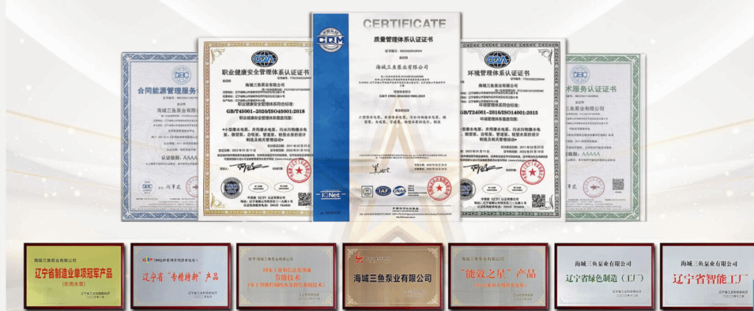 三鱼泵业是国家级高新技术企业,国家级重点专精特新“小巨人”企业 ,省级专精特新“小巨人”企业,辽宁省“智能工厂 ”,辽宁省制造业单项冠军,多次荣获工信部推荐的节能技术,工信部能效之星产品。